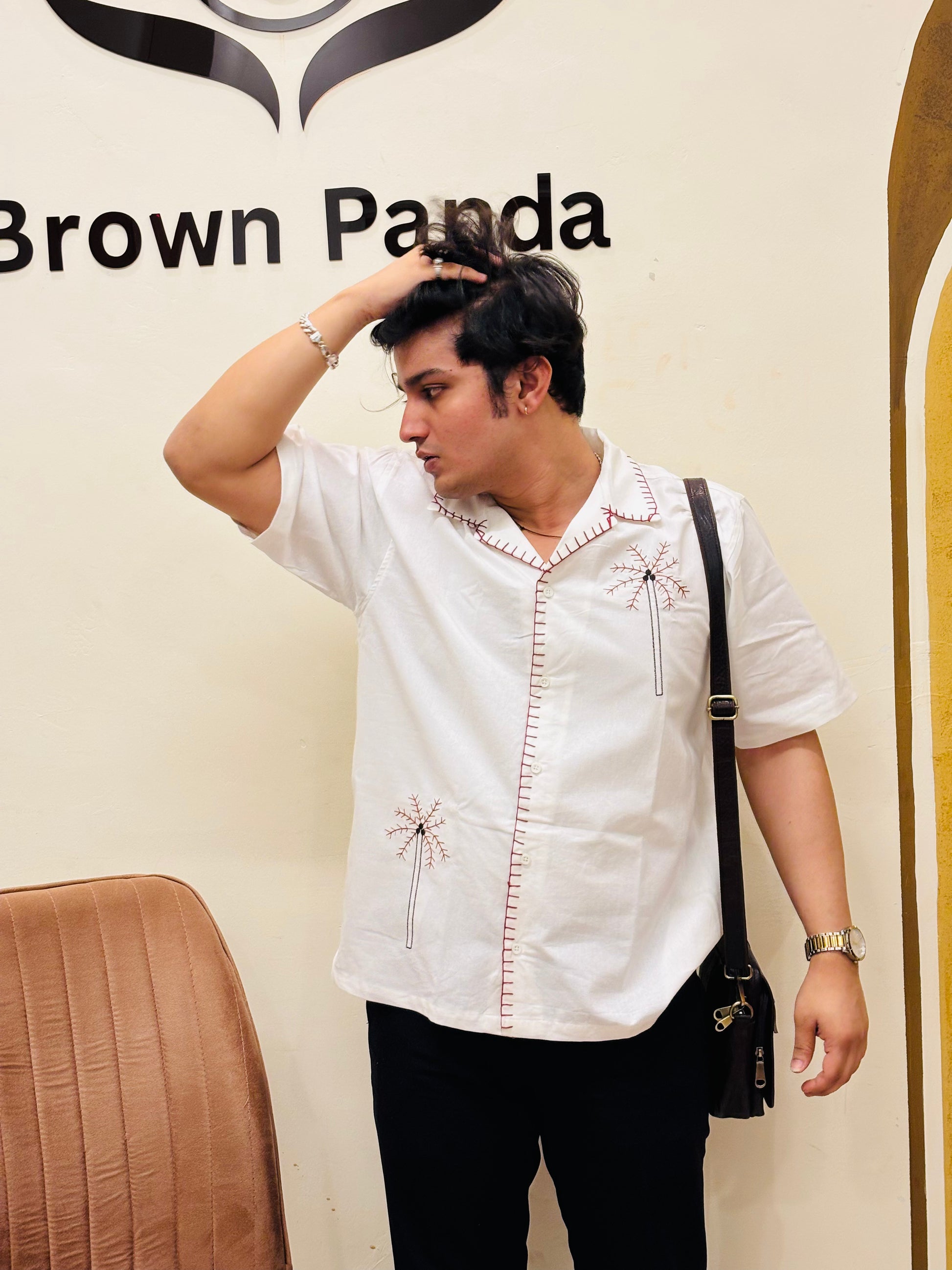 Design: Signature palm tree embroidery with contrast hand-stitch borders.