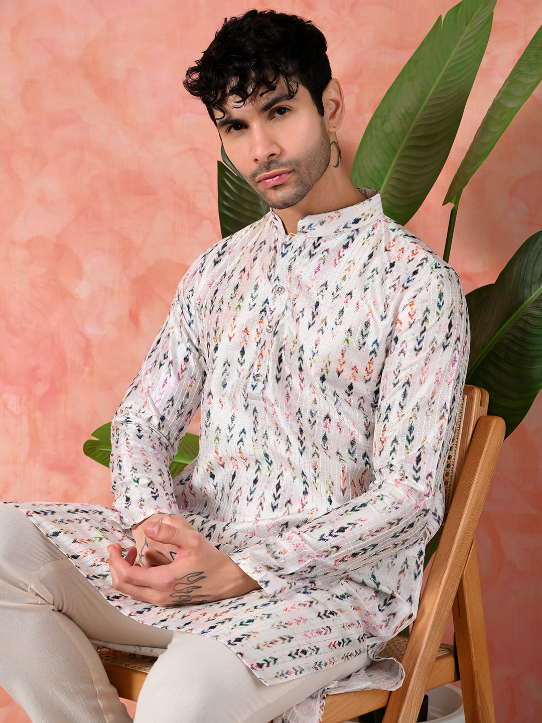 Make a bold statement with this uniquely elegant multicolor abstract Ikat print kurta, designed for the modern man who values tradition with a touch of artistry. Crafted from a subtly textured fabric with metallic accents, this kurta features a premium look and feel, perfect for any festive or celebratory occasion.